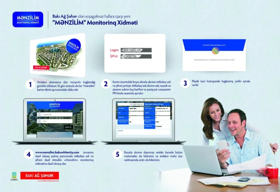 To ensure the confidentiality of information provided on the card, the user name and password are covered with scratch-paint and placed in an envelope, sealed with hologram by a representative of the monitoring group. The property owners enter the user name and password on the website www.menzilim.bakuwhitecity.com and can check all the information about the property. Owners, as well, will receive news about their property with the help of this page.